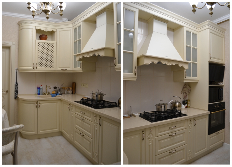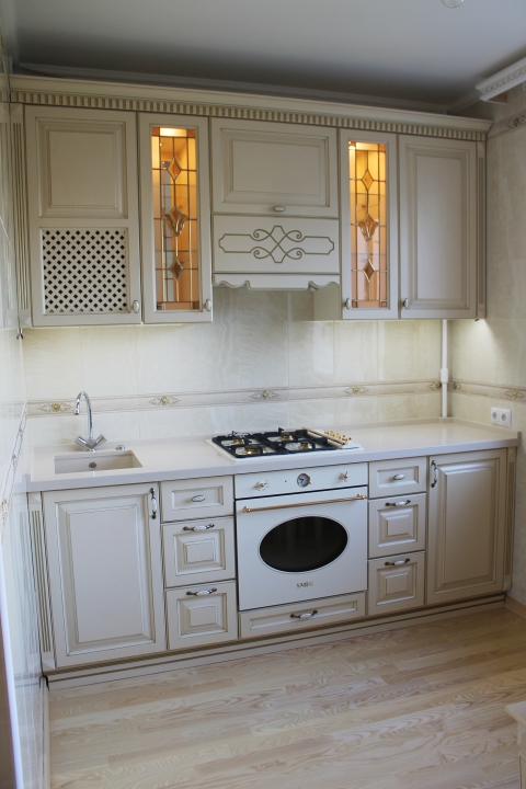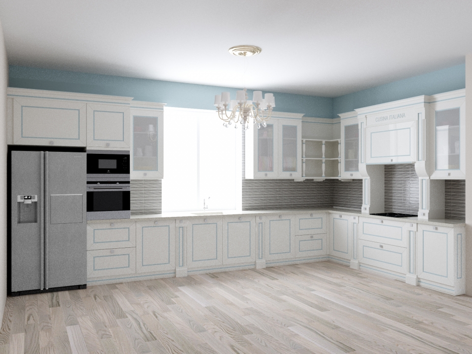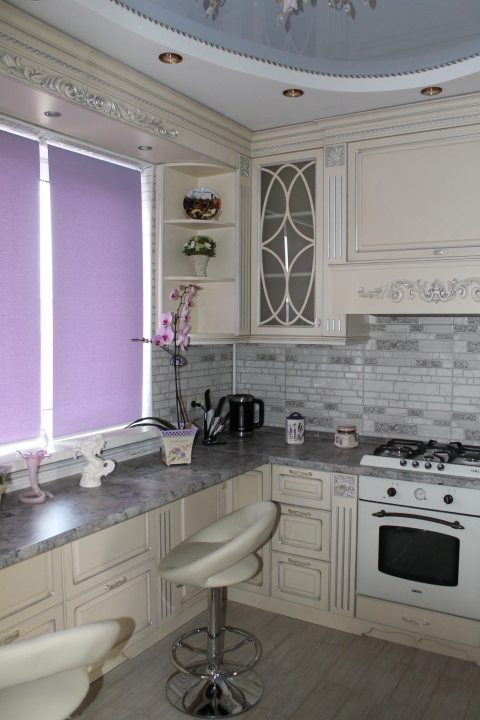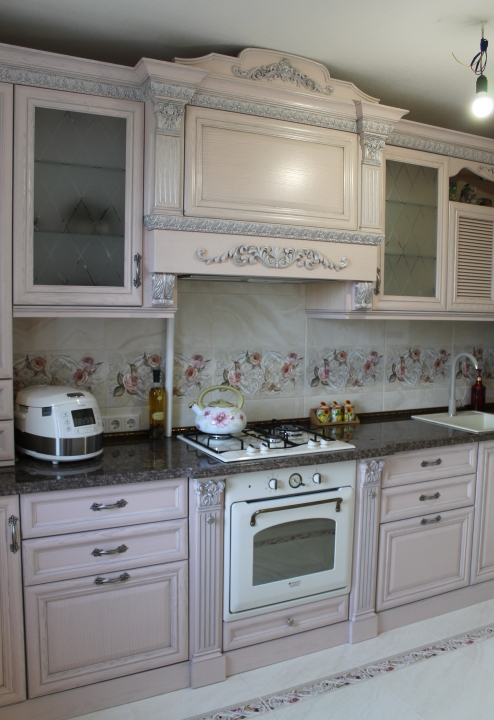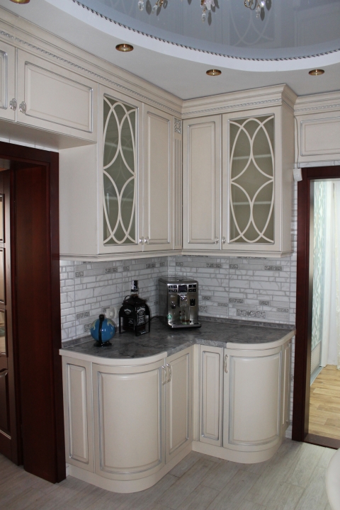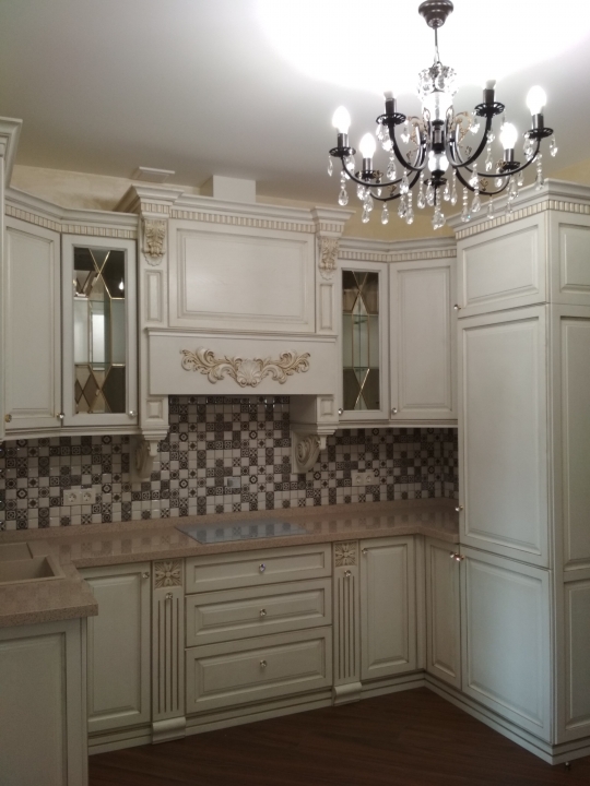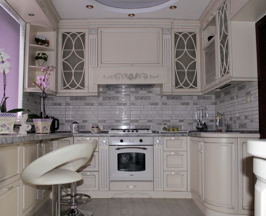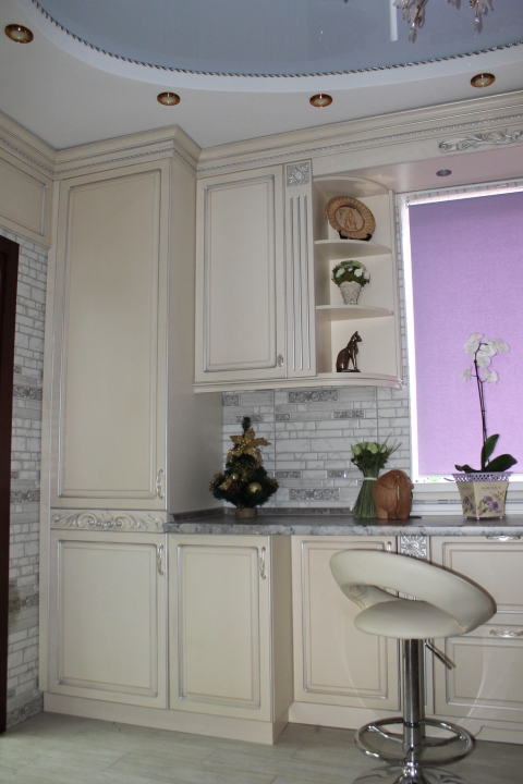 Фасады: МДФ фрезерованные крашенные, серебряная патина Столешница: пластиковая Luxeform Фурнитура: Blum