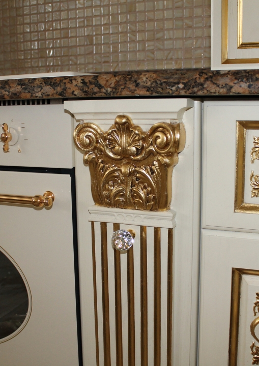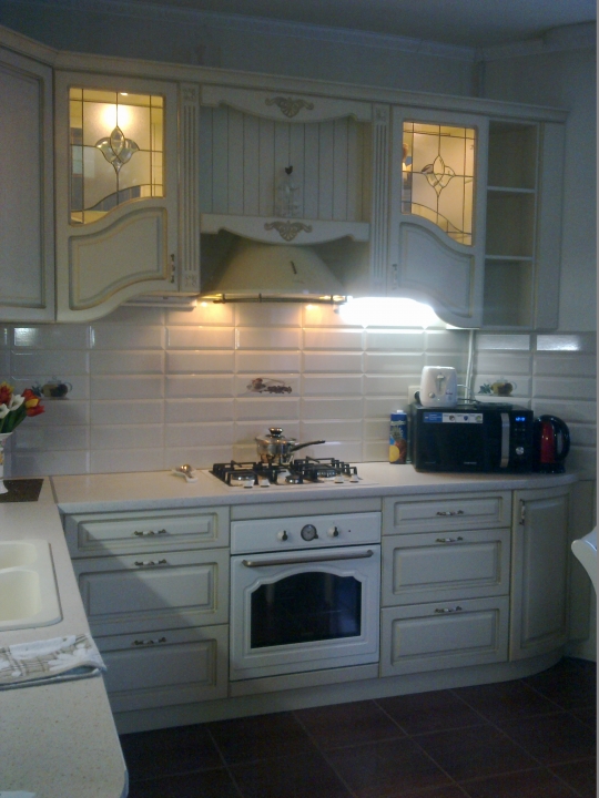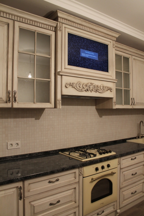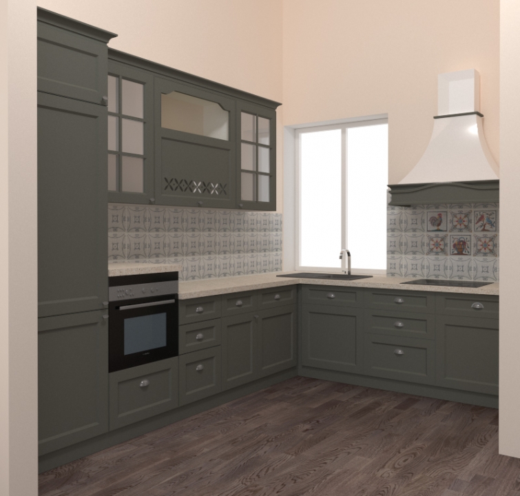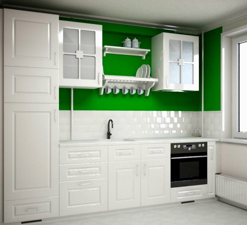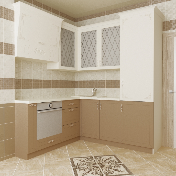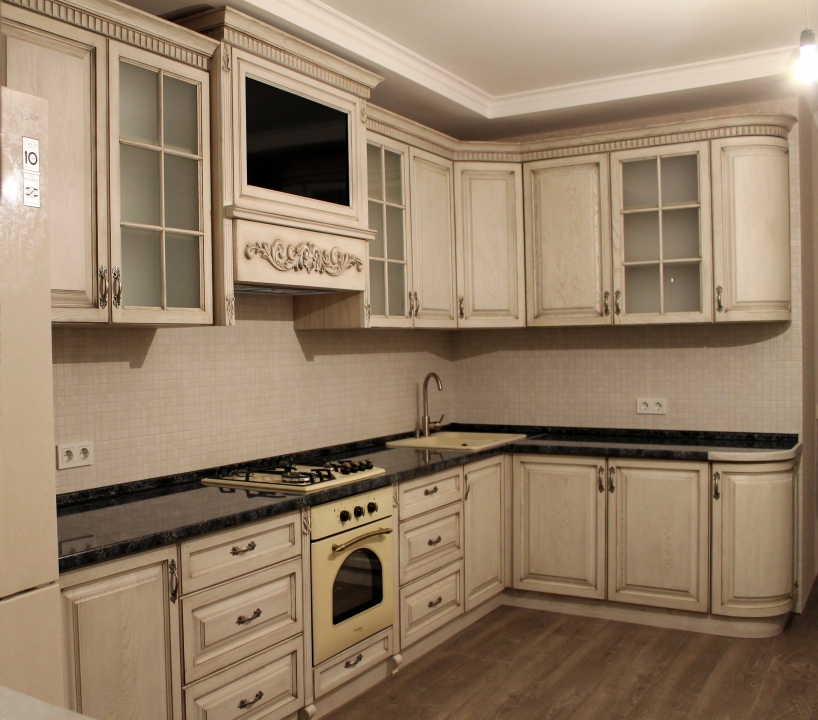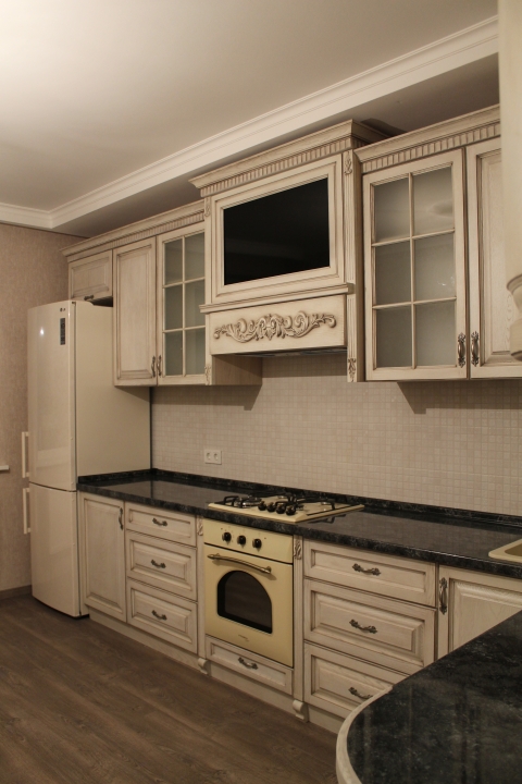 Фасады: МДФ фрезерованные крашенные, серебряная патина Столешница: пластиковая Luxeform Фурнитура: Blum