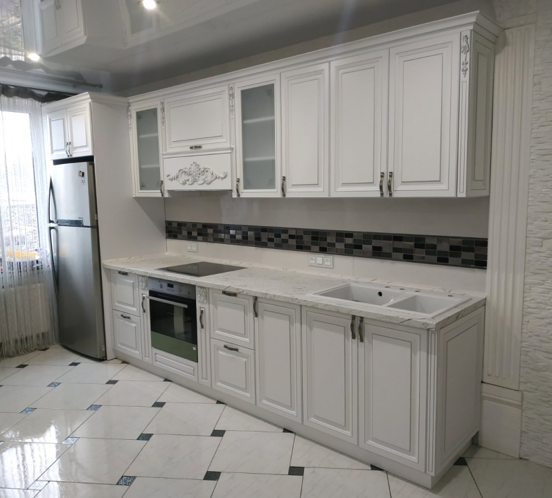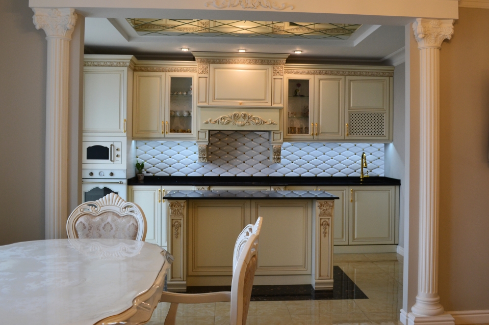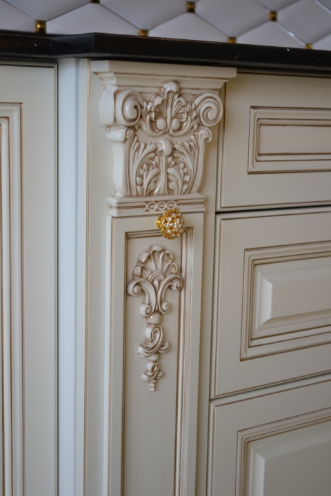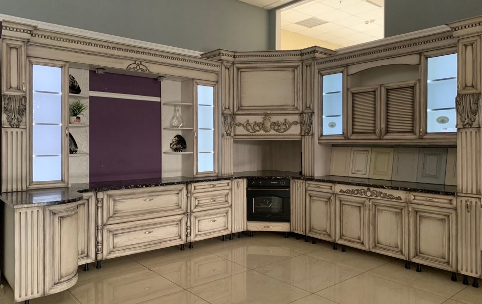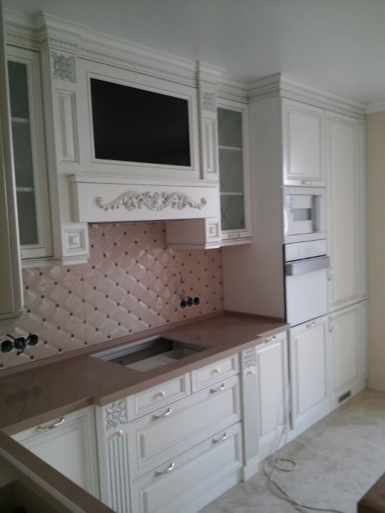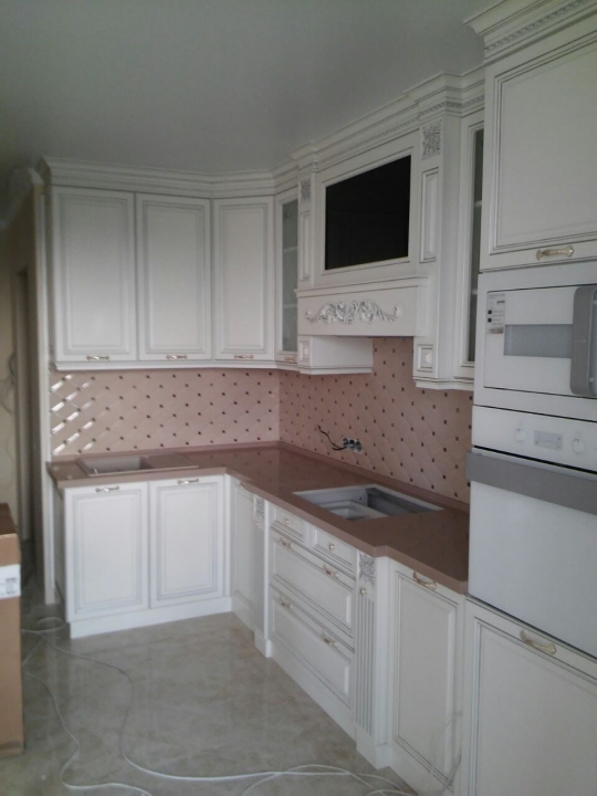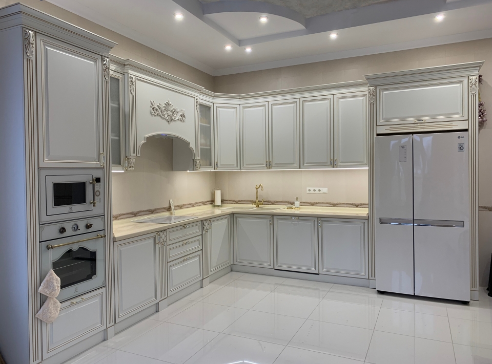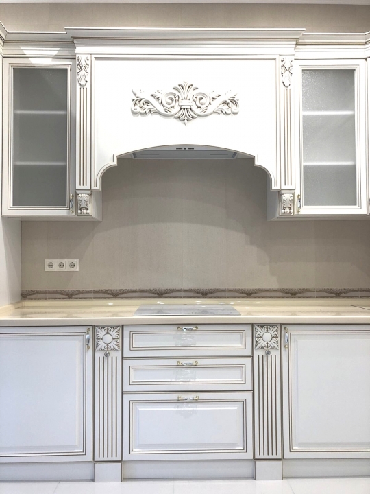 Класична кухня. МДФ фарбовані, фрезеровані фасади з різьбленням та патиною. Фурнітура Blum. Стільниця Egger