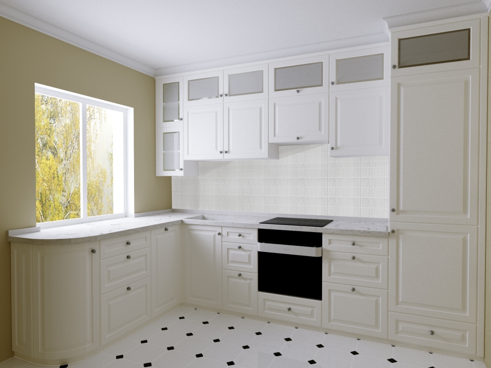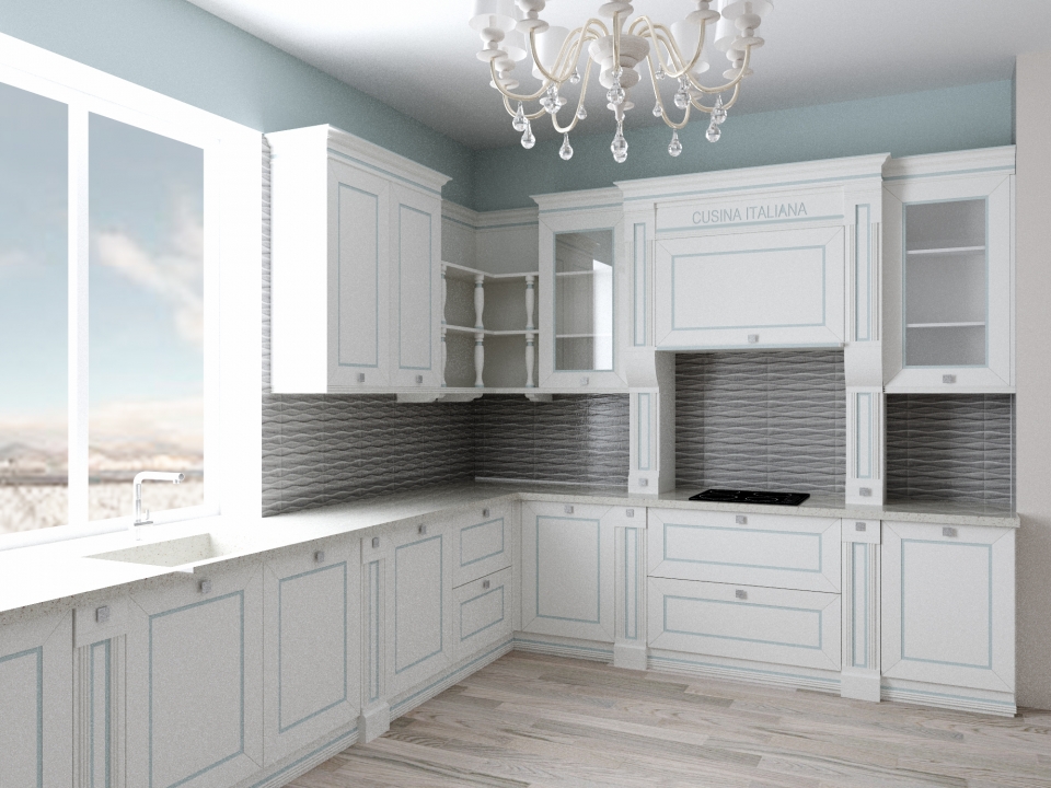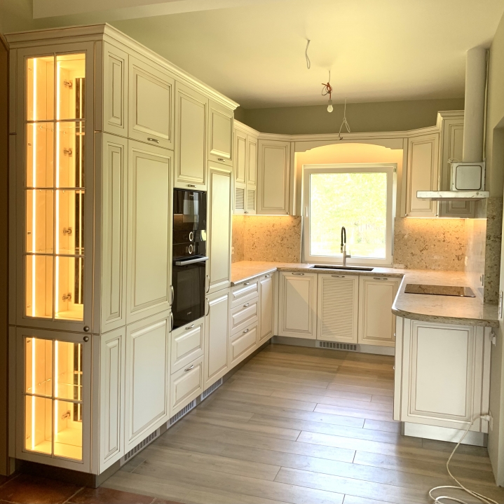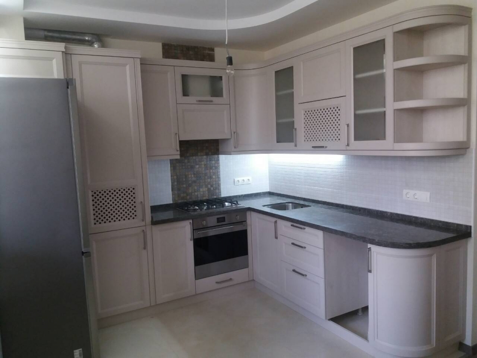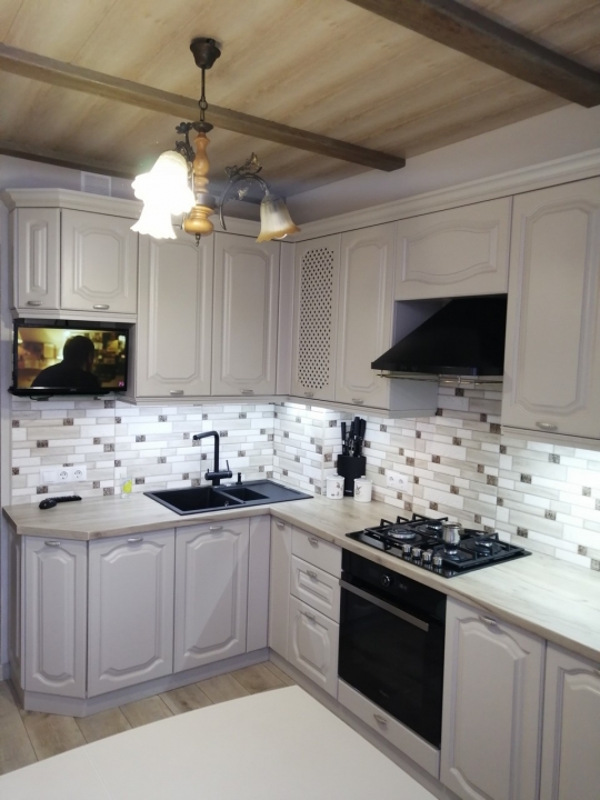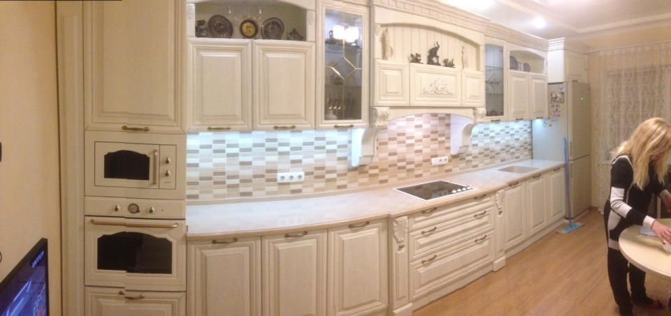 Класична кухня. МДФ фарбовані, фрезеровані фасади з різьбленням та патиною. Фурнітура Blum. Стільниця Egger