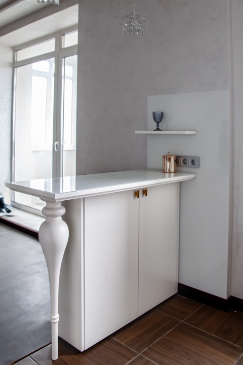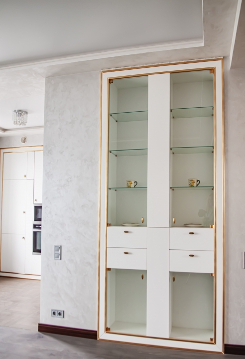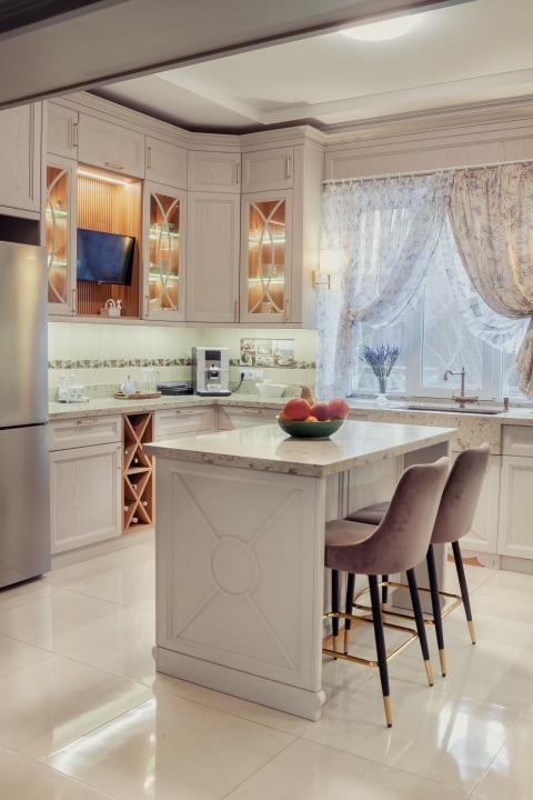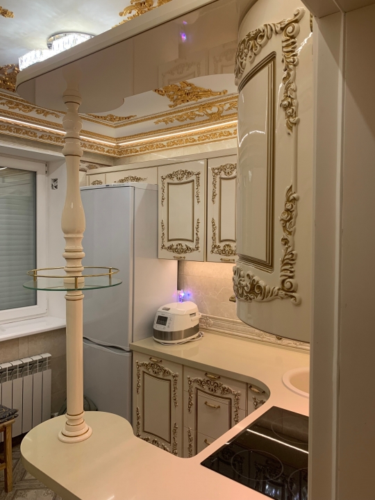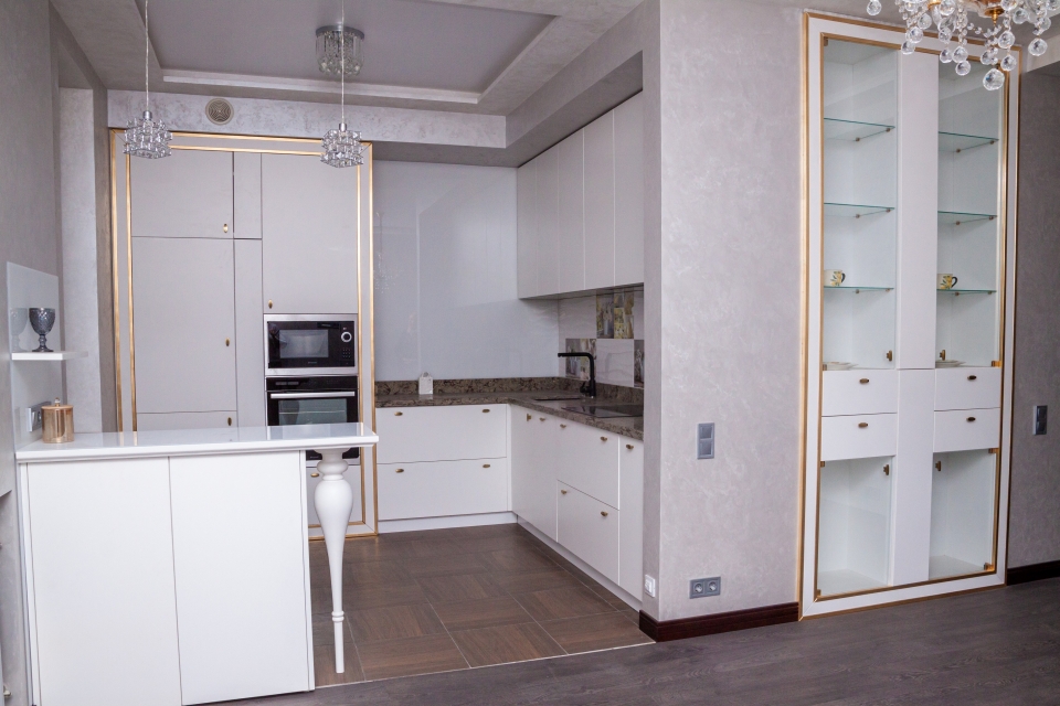 Кухня студія - біла неокласика. декоративні елементи покриті поталею. Стільниця кварцит 20мм, Фурнітура Blum. Стільниця на барній стійці скло Lacobel...
