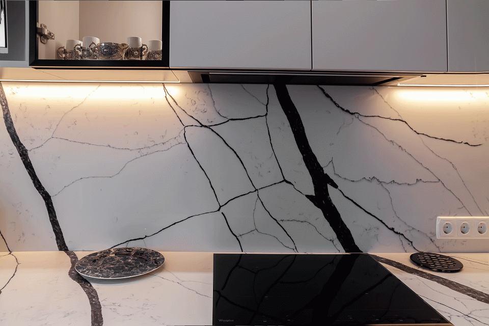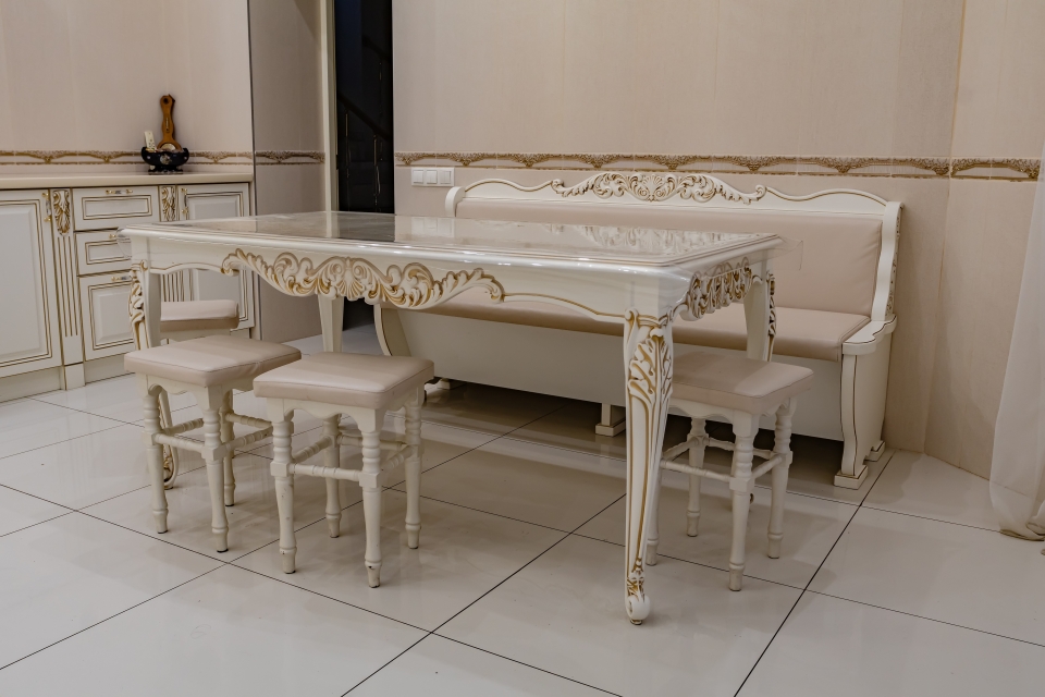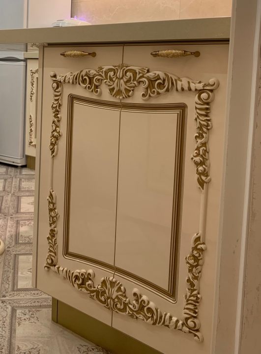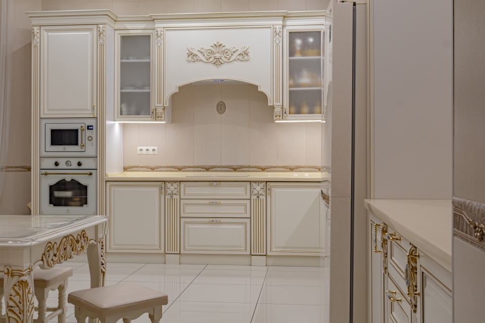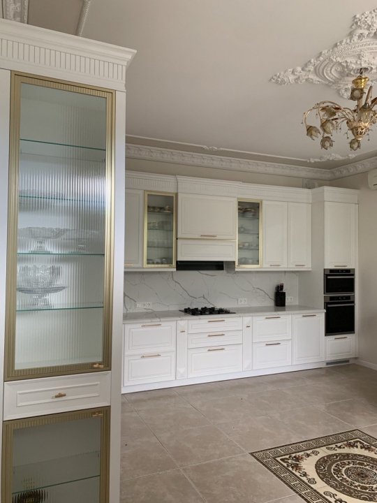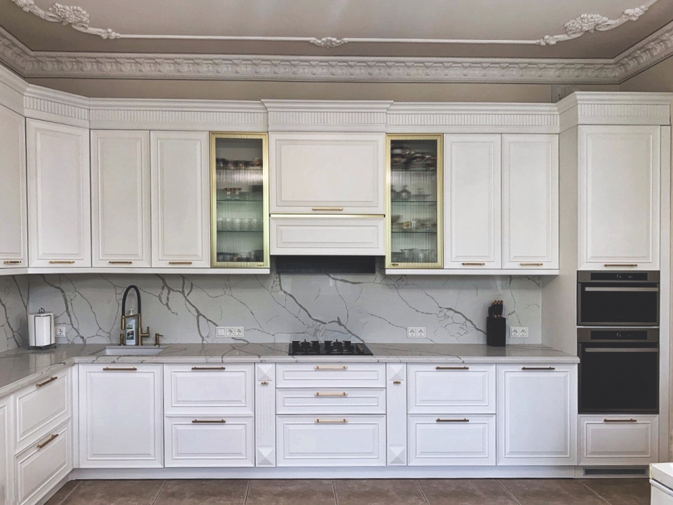 Кухня-Неокласика Білий вишуканий фасад Золота фурнітура. Механізми відкривання та висування Blum, Стільниця Кварцит Calacata 7400