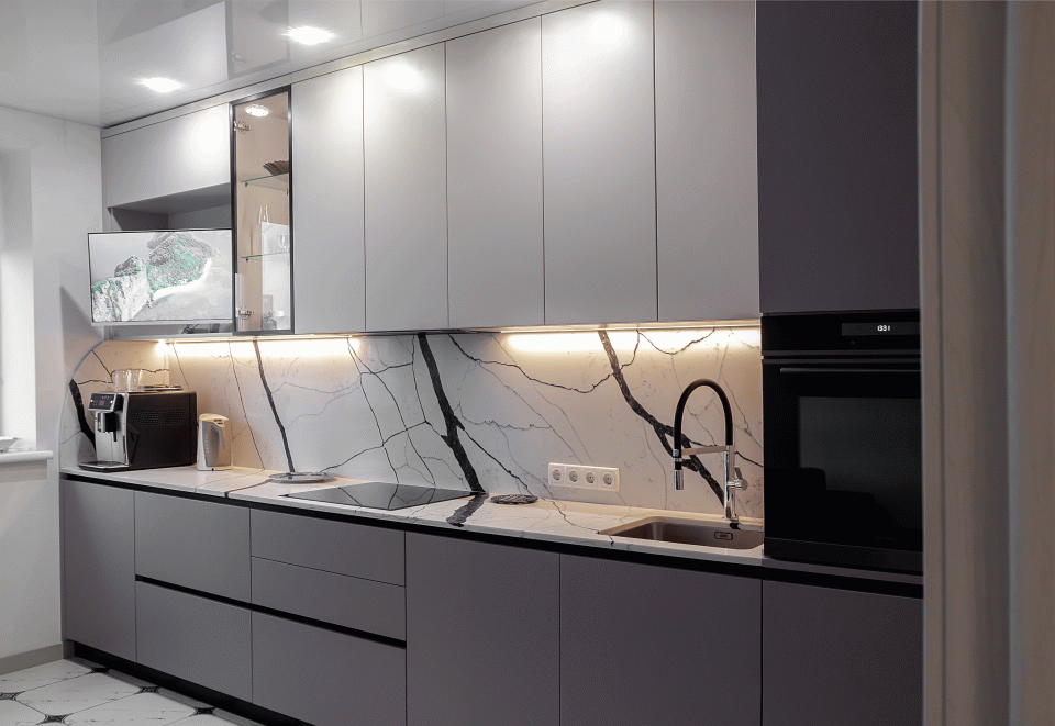 В однокімнатну квартиру. Фасади AGT 3019 supermat (не залишають відбитків пальців на фасадах). Фурнітура Blum. Стільниця та Корпус Kronospan. Фасад пі...