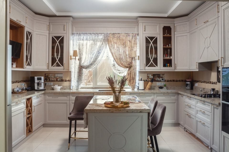 Кухня класика колір слонова кістка з патиною, з вікном в центрі, фурнітура ВLum, стільниця та станова панель Кварцит