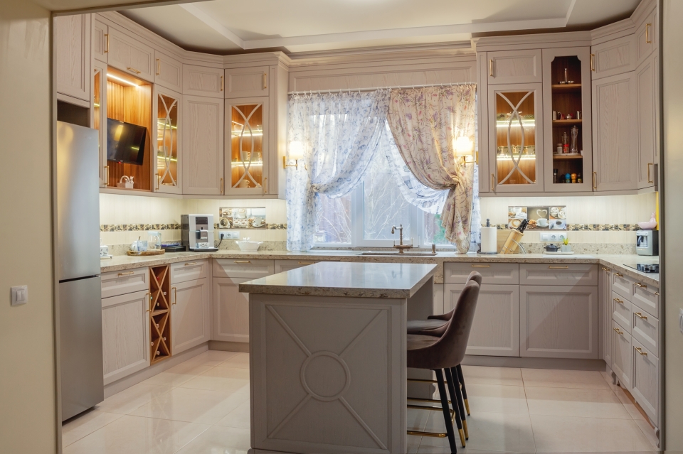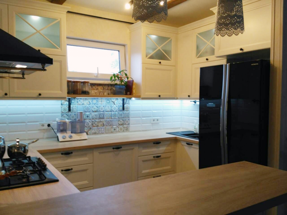 Кухня студія в будинку в стилі неокласика Трендовий Колір фасадів Кашемір NCS S 2005-Y60R із поєднанням із теплим кольором дерева. Фасади Масив ясена....