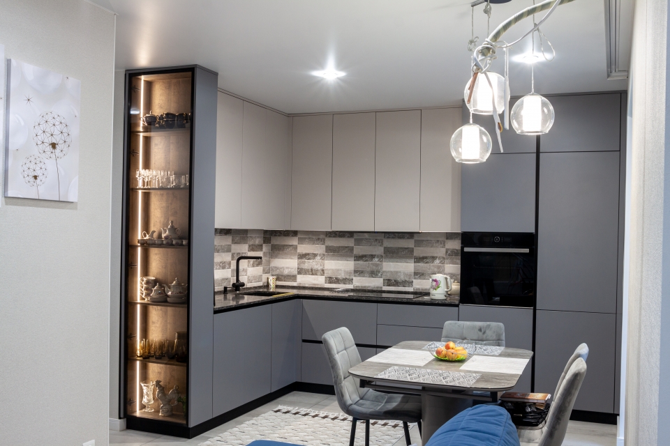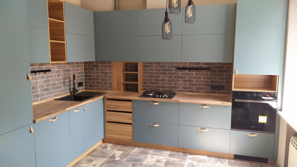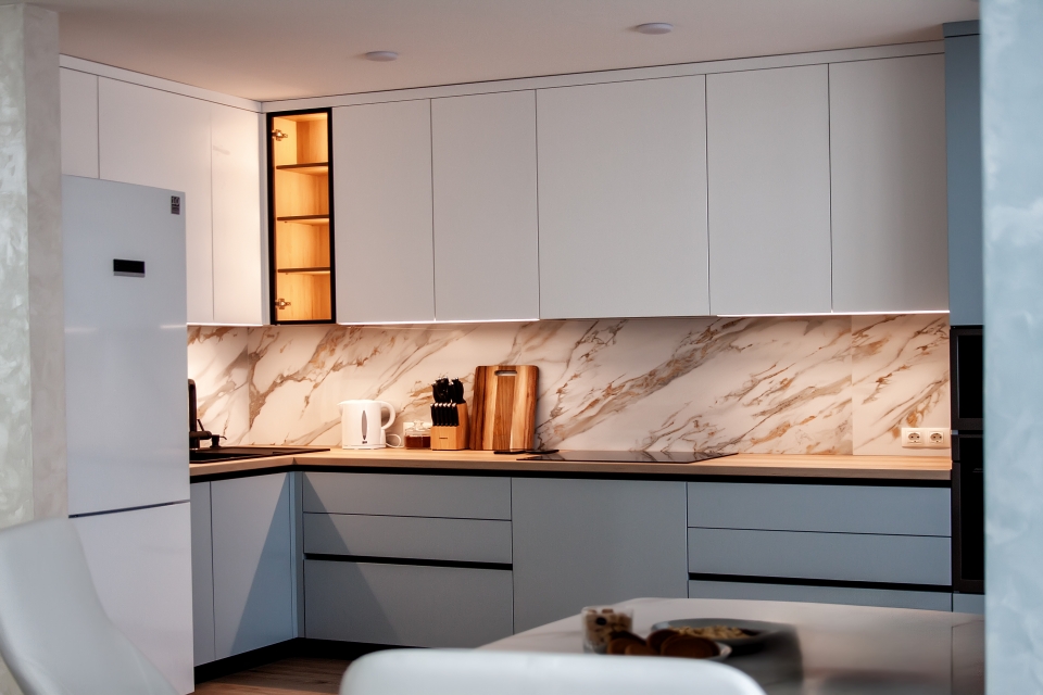 Кухня в сучасному дизайні З ручками Golla. З вітриною із підсвічуванням Верху Білий базовий. Низа сіро-блакитні фасади МДФ матове. Стільниця Kronospan...