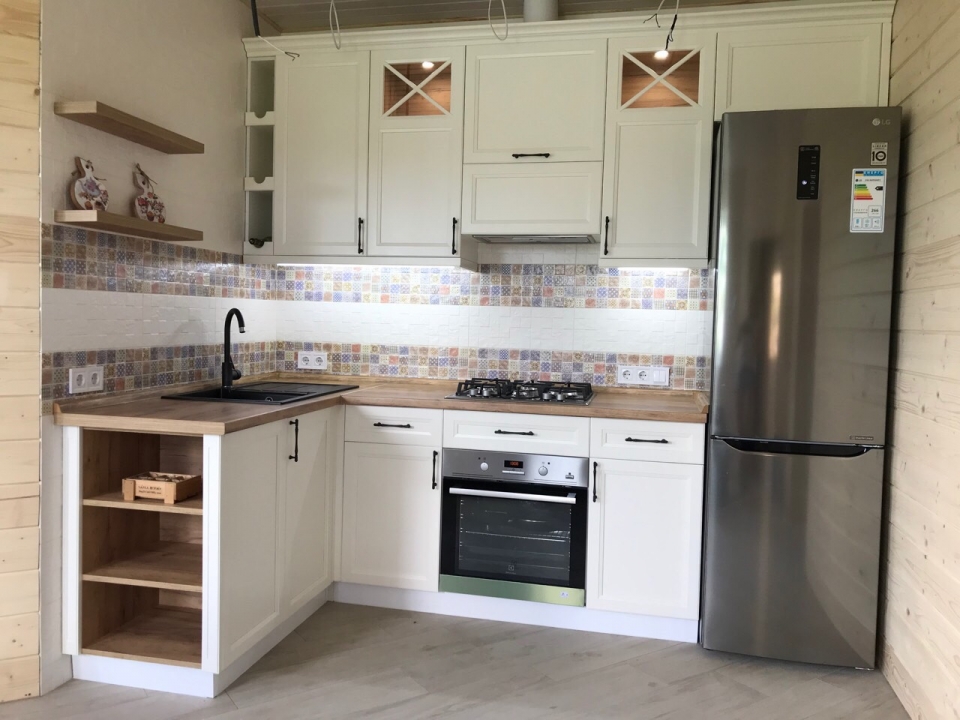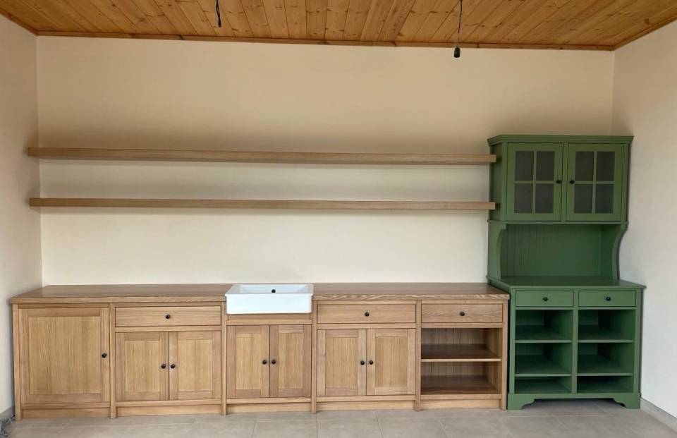 Кухня в стилі Кантрі з масиву ясена. Фурнітура Blum. Стільниця Масив. Буфет Масив ясеня Оливкового кольору