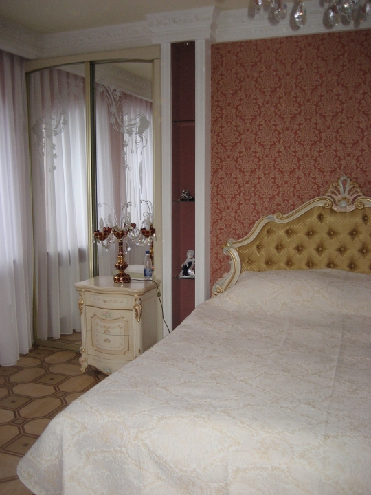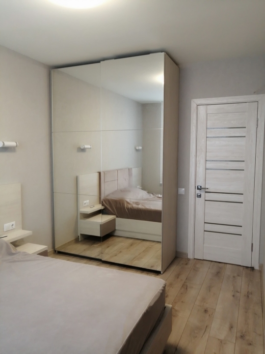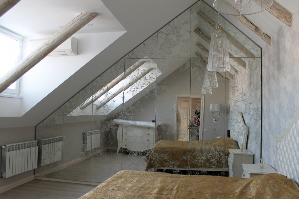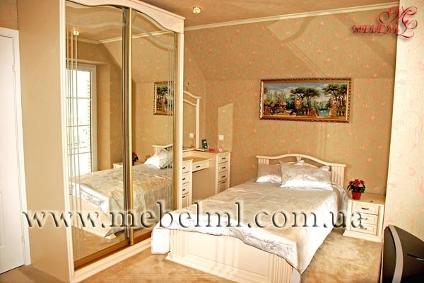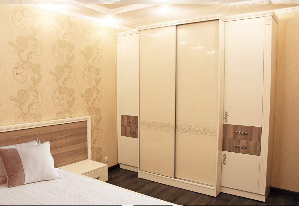 Спальня з шафою купе у ніші. Розсувна система Slim наповнення фасадів скло лакобель Ral 1013 різьблений багет по периметру