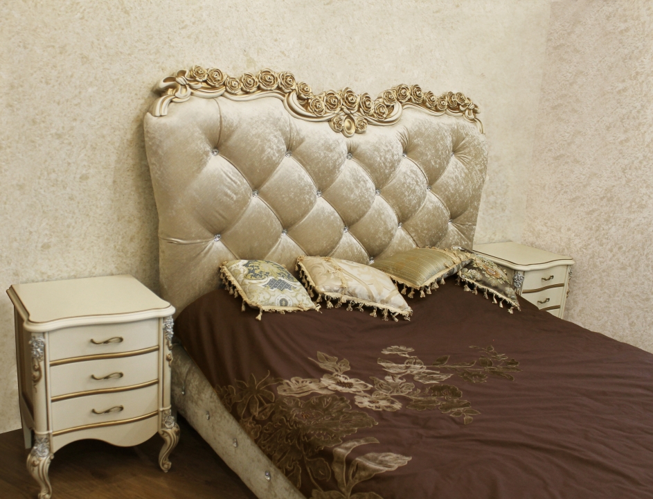 Ліжко з м'яким узголів'ям. Тумбочка фасад Багет і скло лакобель