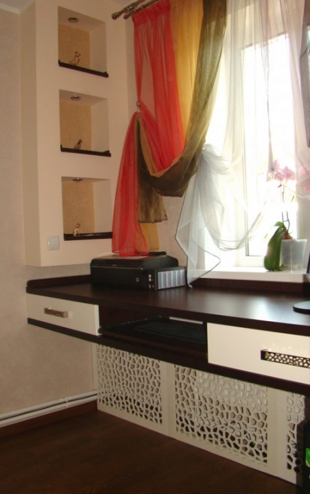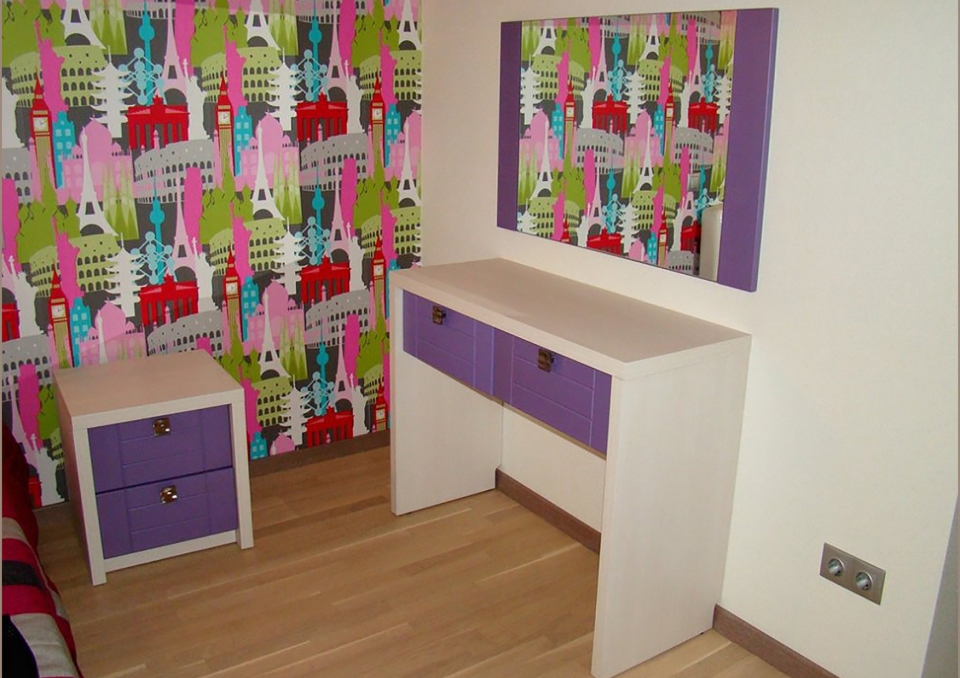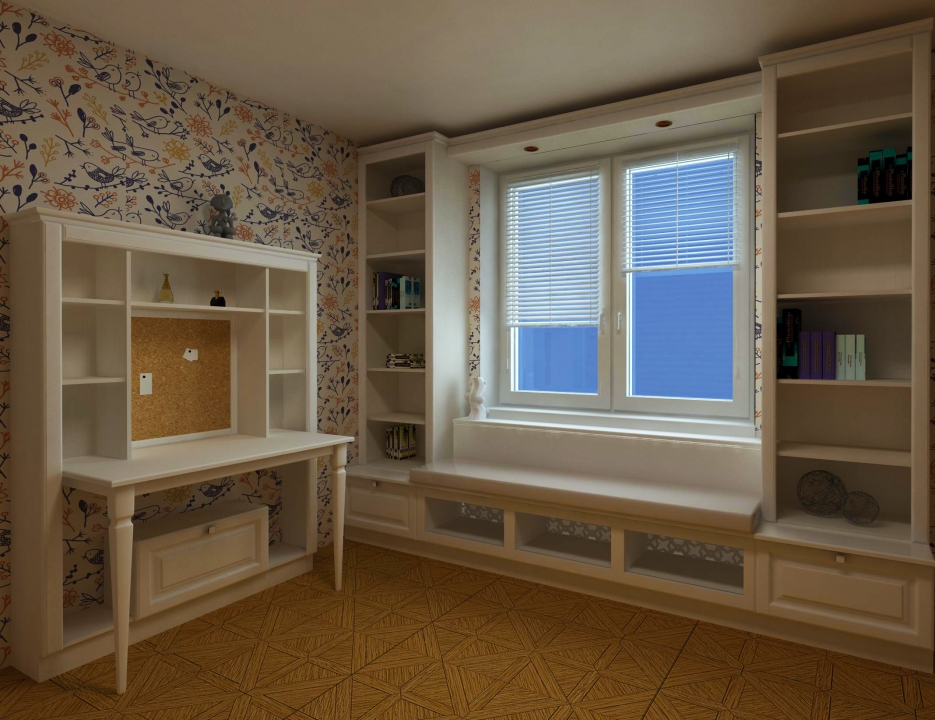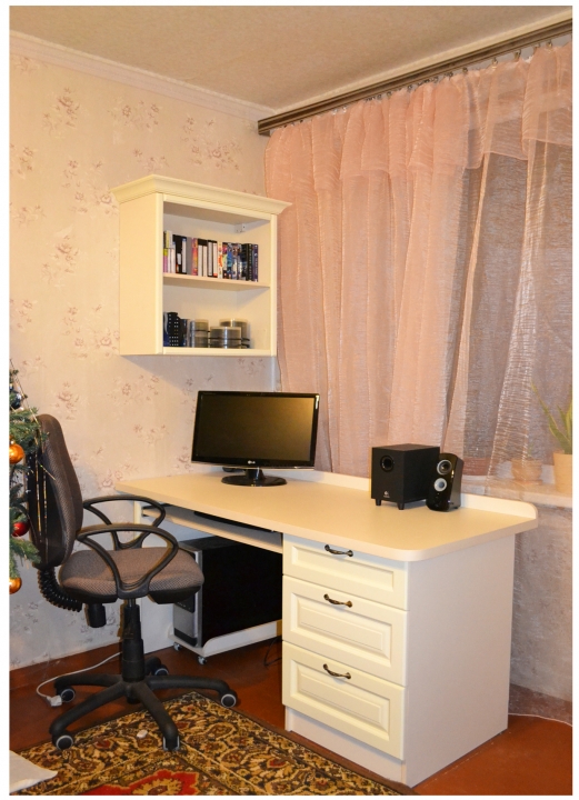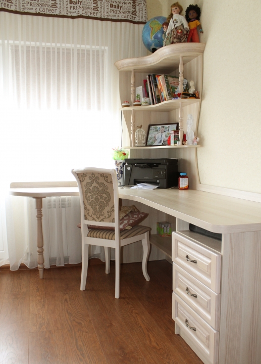 Маленька дитяча для двох дівчаток. Стіл під вікном ДСП Білий Альпійський. Вільха білий базовий.