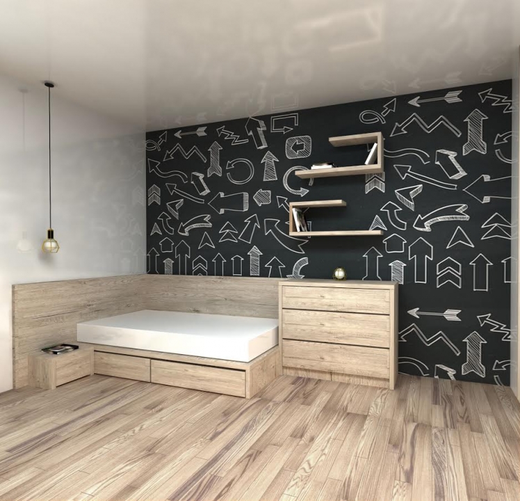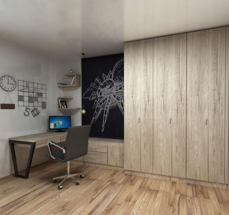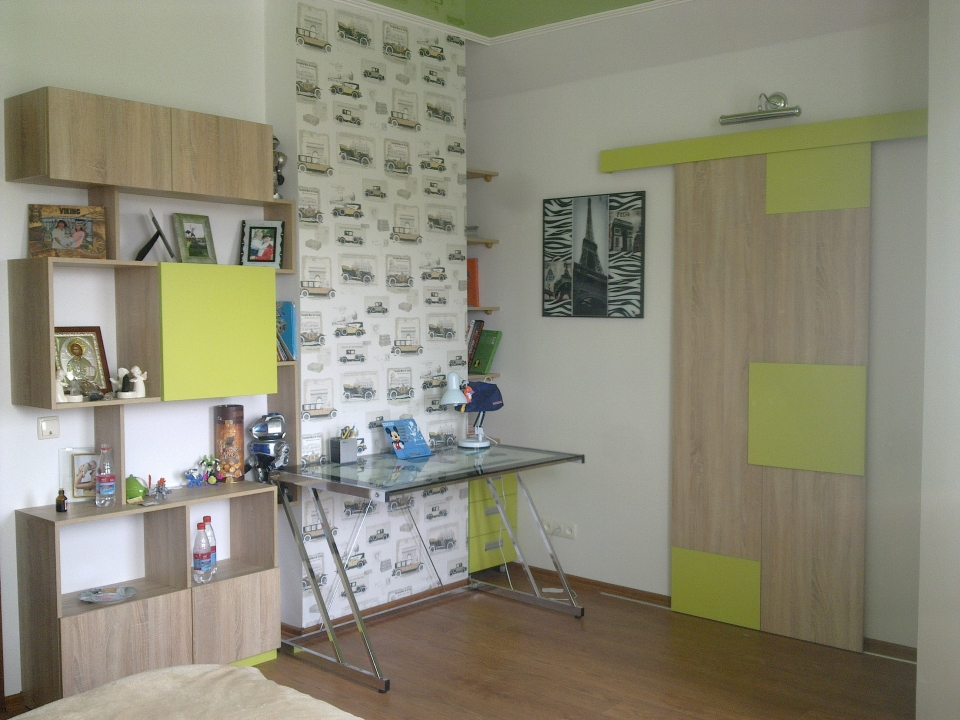 Кімната хлопчика. ДСП Swisspan , Дуб Шервуд, фурнітура Linken Відкриття Дверей push-to-open( по натиску). Опора столу металу чорна. Крейдяні шпалери