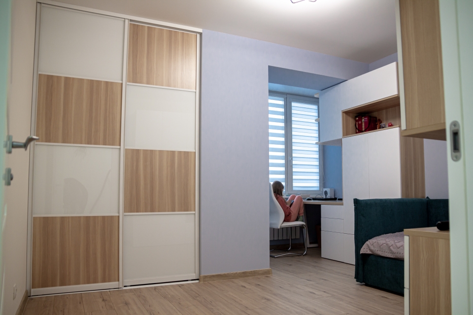 Дитяча У Скандинавському стилі. Теплий білий і деревини структури. З робочим столом на лоджії, що утеплює. ДСП і МДФ Kronospan, фурнітура Blum. Фасади...