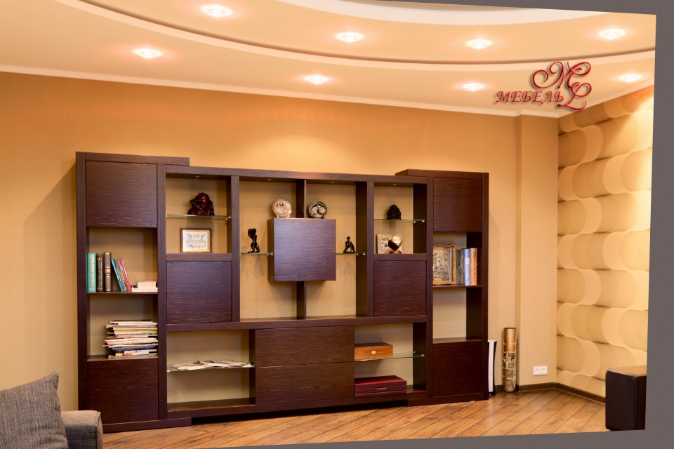 Сучасні гірка стелаж в залі. Виконана із шпону Венге. Фурнітура BLUM