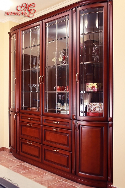 Гірка шафи для посуду. Виконана з масиву ясена. Вітражні фасади.