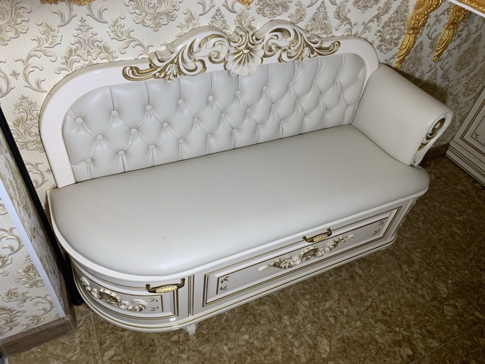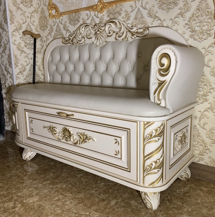 Банкетка різьблена в передпокій масив вільхи, МДФ. Оббивка-Шкіра натуральна Фарбування - глянець NCS S 0505- Y30 R плюс патина золото