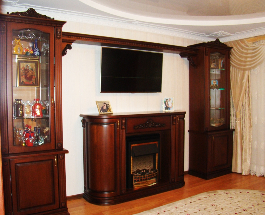 Класична різьблена гірка тумба TV та кутовий вбудований у нішу портал для каміна. Колір горіх. Масив ясена